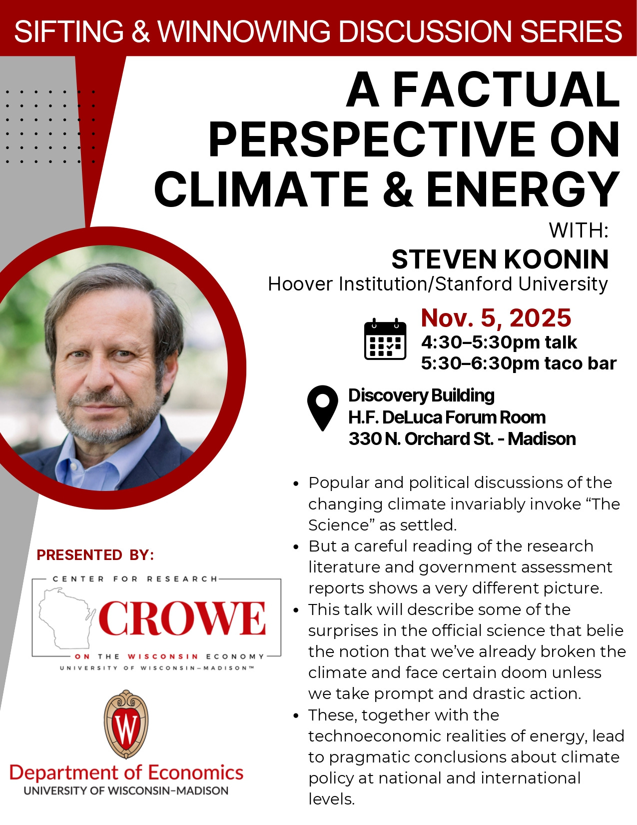 EventsA Factual Perspective on Climate & EnergyWednesday, November 5th, Hosted by the Center for Research on the Wisconsin EconomyThe Madison FederalistNov 02, 2025ShareSteven KooninHoover Institution/Stanford UniversityWednesday, November 54:30-5:30pm: Lecture5:30-6:30pm: ReceptionUW-Madison Discovery BuildingH.F. DeLuca Forum Room330 N. Orchard St.Madison, WI