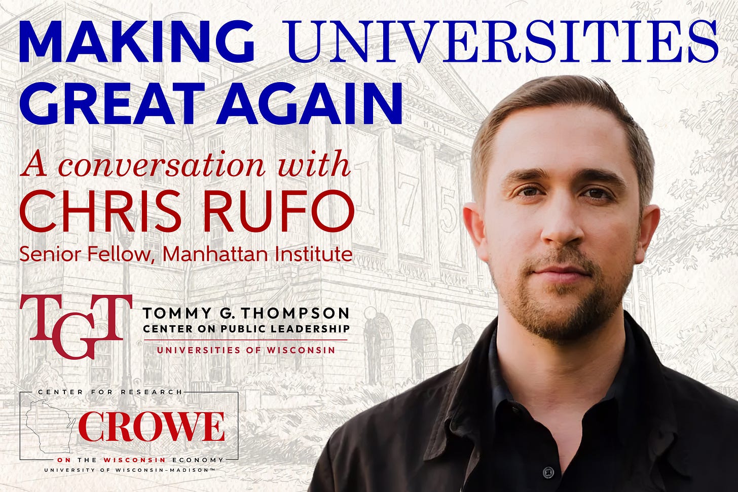 WHAT: Join us for a moderated discussion with Christopher F. Rufo, senior fellow at the Manhattan Institute and author of the New York Times best-selling book America’s Cultural Revolution. Rufo, a prominent voice in debates over diversity programs, critical race theory, and the future of American higher education, will share his perspective on the challenges facing universities today and his vision for reform. The conversation will explore questions of academic freedom, institutional purpose, and the relationship between universities and the public they serve. Whether you agree with his approach or not, this event offers an opportunity to hear directly from a figure at the center of these consequential debates and to understand the ideas reshaping higher education policy across the country.