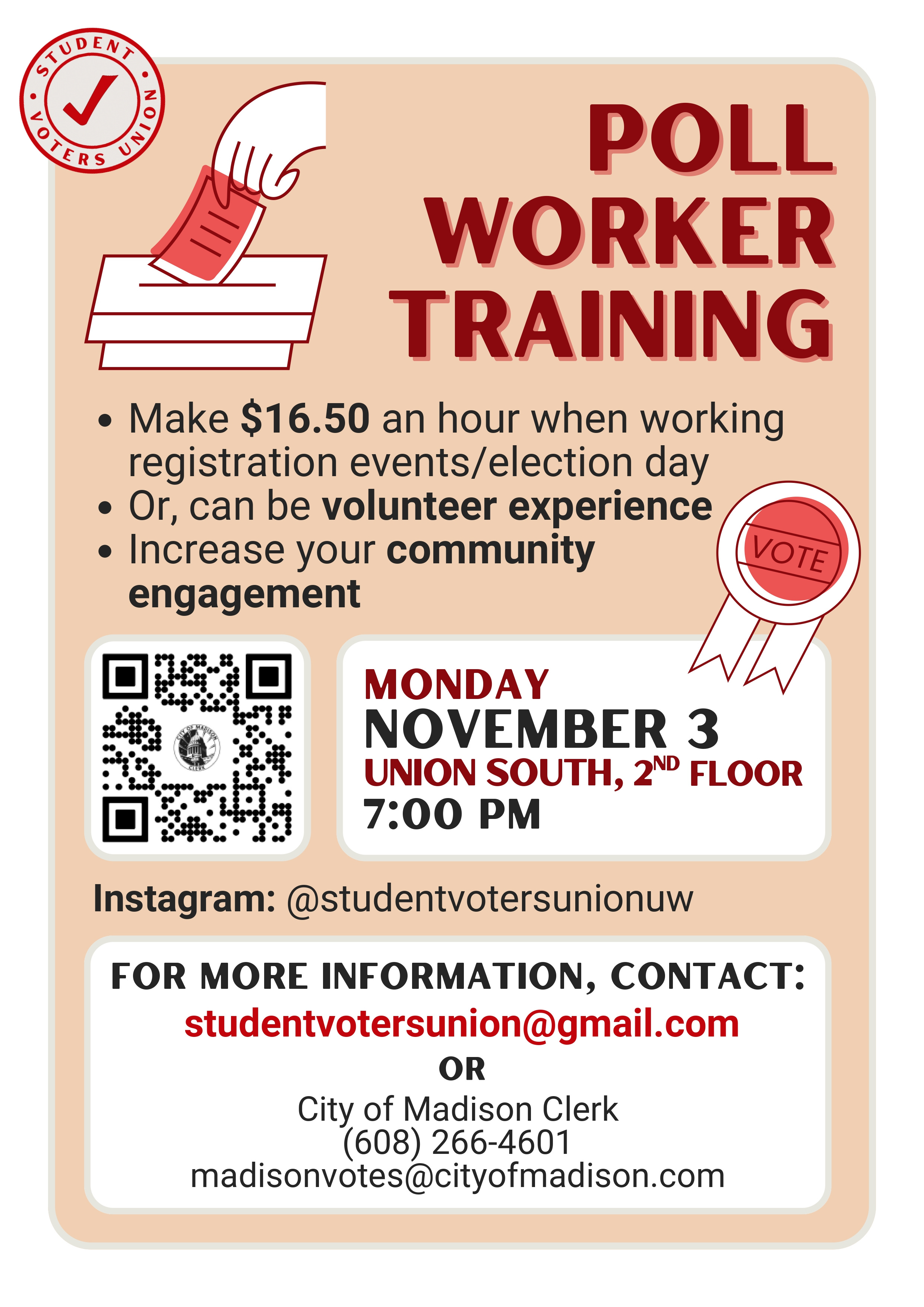 On Monday, November 3rd, SVU is partnering with the Madison City Clerk’s Office to hold a Poll Worker Training and Recruitment Event at 7 pm in the Fifth Quarter Studio on the 2nd floor of Union South. This event will include a presentation and training by the City on the roles of poll workers, including how to perform voter registration and help administer elections. Poll workers can choose to volunteer or they can be paid at a rate of $16.50/hr, making it a great opportunity for students to get some extra income.