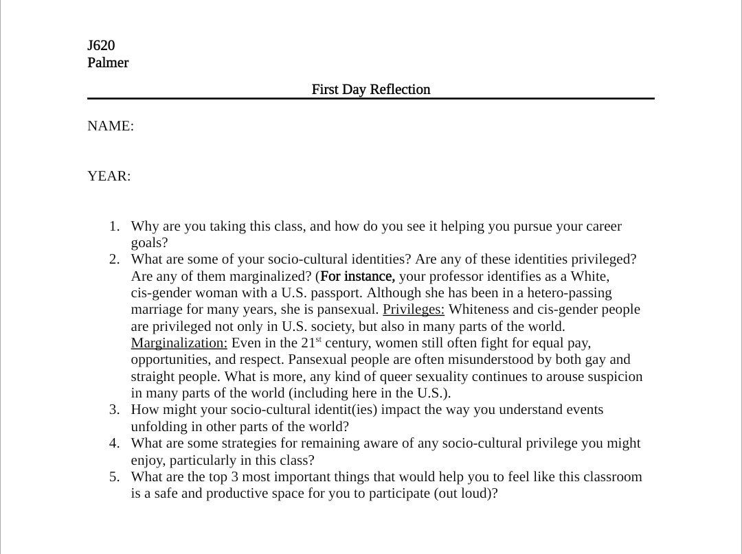 The “First Day Reflection” for Journalism 620: International Communication asked students, “What are some of your socio-cultural identities? Are any of these identities privileged? Are any of them marginalized?”