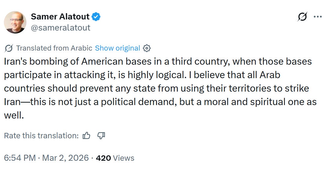 On March 2, a post written in Arabic claimed that the bombings of American bases by Iranian forces were either “highly” or “completely” logical, depending on the translation. In the same message, he voiced his belief that Arab states should prevent other nations from using their territories to strike Iran, calling this not a mere political demand, but a “moral and spiritual one.”