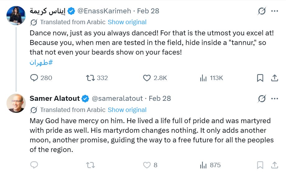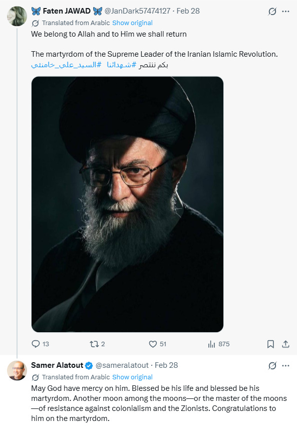 After Khamenei was confirmed to be dead, Alatout praised him for leading “resistance against colonialism and the Zionists” and congratulated him on his “martyrdom.”